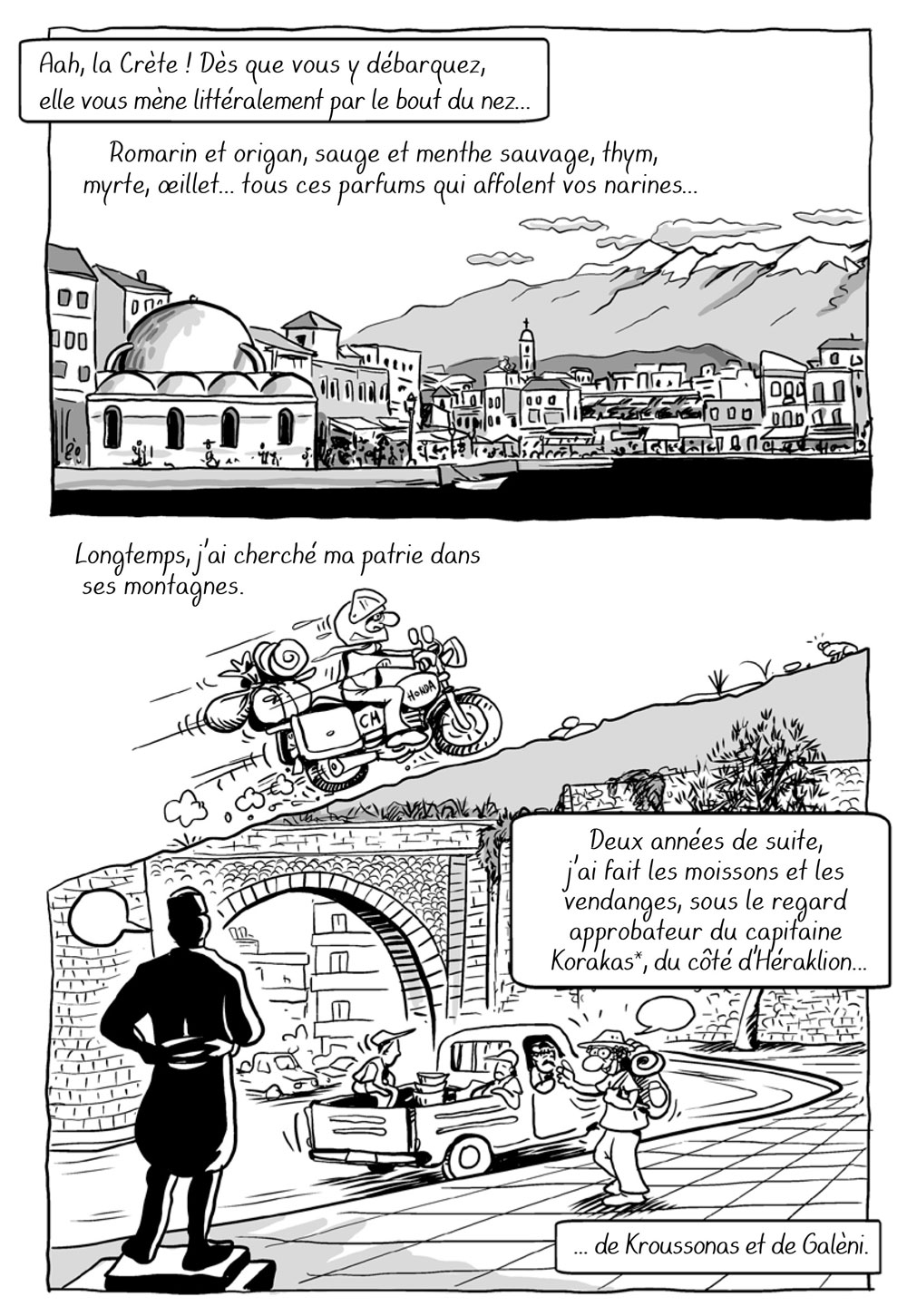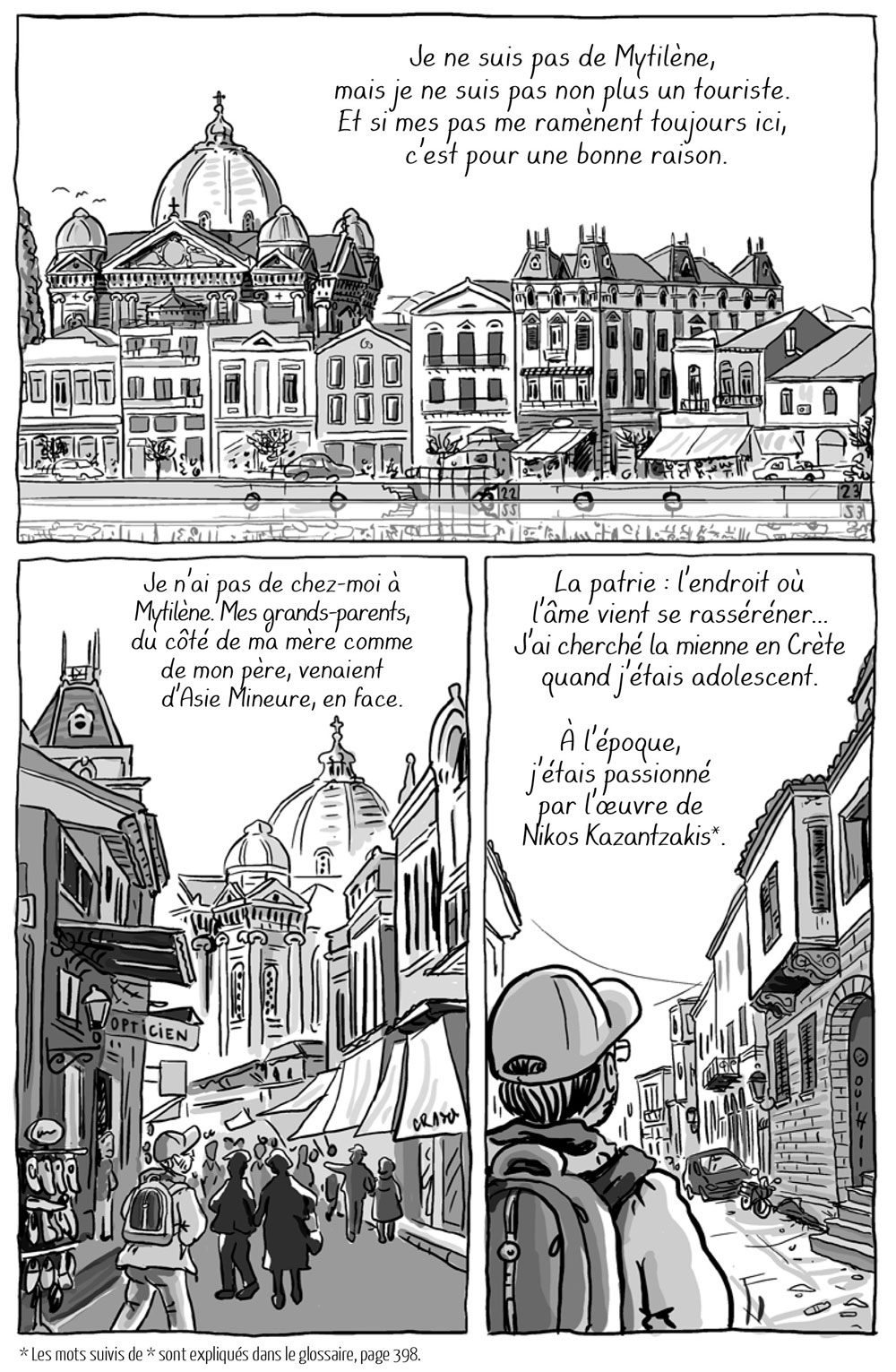Soloup tente enfin, surtout, de comprendre. Et les relents xénophobes qui ébranlent la Grèce ces derniers temps n’y sont peut-être pas pour rien. La dernière partie de son album est l’occasion d’une rencontre avec Mehmet, un jeune universitaire turc. S’engage alors un dialogue sur les raisons profondes de cette méfiance ou défiance greco-turque, débat vite élargi aux sources universelles des haines nationalistes. S’arrêtant à leur différend particulier, Soloup et Mehmet évoquent deux perceptions ancestrales distinctes de la géographie locale : à l’esprit d’aventure et de découverte des marins hellènes s’oppose l’enracinement viscéral des paysans turcs à leurs terres. Cela remonte loin, jusqu’à l’étymologie du toponyme Kydoniès / Aïvali : « coing » pour les premiers, « lieu où poussent les coings » pour les seconds. Invoquant le grand peintre Fotis Kontoglou, le plus célèbre des exilés d’Aïvali, Soloup se fait grave : « l’Homme, de lui-même, finit par oublier ses souffrances », au risque d’oublier celles qu’il est capable d’infliger aux autres à l’appel des « patriotards » haineux de tout bord.