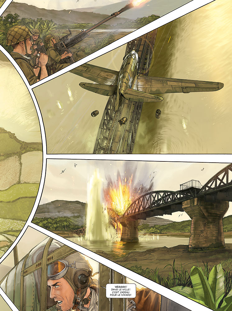 On est toujours bluffé par le dessin de Romain Hugault et la précision diabolique de la reconstitution historique, que ce soient les uniformes, les avions, les marquages ou les décors. Yann, qui est un vrai fana d’aviation, soigne particulièrement la documentation. Même en passant à la loupe toutes les cases, les plus pointilleux des spécialistes auront du mal à trouver une erreur. Et puis il y a le ballet aérien des P40, Thunderbolt, P38 Lightning et autre Black Widow, l’avion héros de ce tome 2, des merveilles auxquelles il ne manque pas un rivet. Côté scénario, Yann fait monter peu à peu la pression. Il part sur plusieurs pistes. On ne découvre que tardivement les motivations de la belle Angela dont le nom est peint sur l’avion de Clower baptisé désormais “Angel Wings”. Yann rappelle aussi le rôle important du tout nouveau service de renseignement américain, l’OSS (Office of Strategic Service), ancêtre de la CIA, qui va utiliser les ethnies birmanes contre les Japonais et les payer en opium. Une technique reprise aussi pendant la guerre du Vietnam. Et pour corser sa passion du détail historique, le scénariste introduit la Rose de Tokyo (en réalité une douzaine de Japonaises anglophones), qui tente à la radio de démoraliser ses ennemis yankees. Rien à dire donc sur la grande Histoire que Yann ne trahit jamais bien au contraire. Un tome 2 qui donne quelques réponses et relance l’action, ajoute un second personnage féminin, Jinx, à l’intrigue, et garde le pilote Clower en embuscade. Sans trahir le suspense, c’est au tour de la jungle birmane d’abriter la suite d’Angel Wings dans le tome 3 pour des aventures plus terrestres.