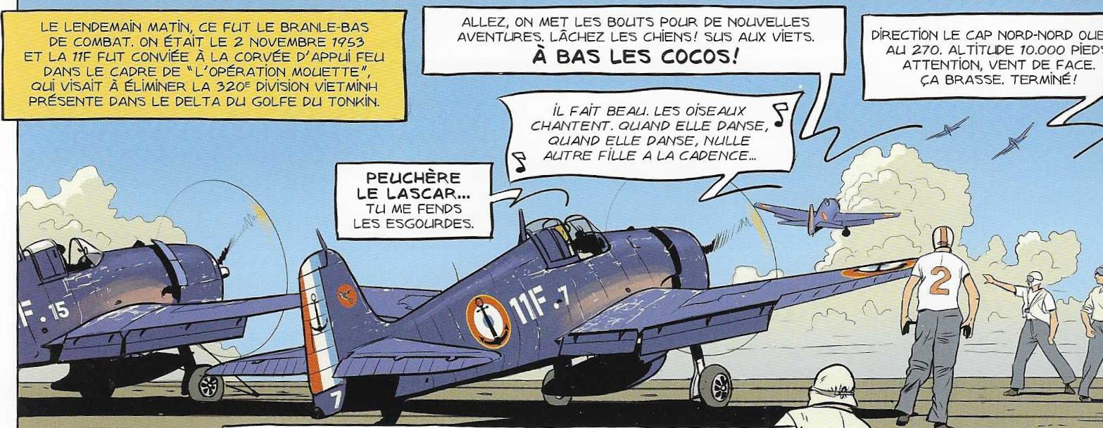 Les quatre avions représentés ci-dessus forment une patrouille qui revient d’une intervention à l’intérieur des terres. L’équipier de tête fredonne : « je m’en viens de balancer mes ananas sur les viets ». Comprenons que ces appareils viennent d’effectuer une mission d’« appui feu » (mitraillage et bombardements aériens) sur des troupes vietminhs au sol et ils rentrent « à la baille », c’est-à-dire au porte-avions qui évolue en dessous d’eux. D’après leurs marques, on peut identifier que ce sont des F6F Hellcats de la flottille 1F basée sur l’Arromanches, le porte-avions dont on aperçoit la silhouette aisément reconnaissable page 5, sur l’image ci-dessous.