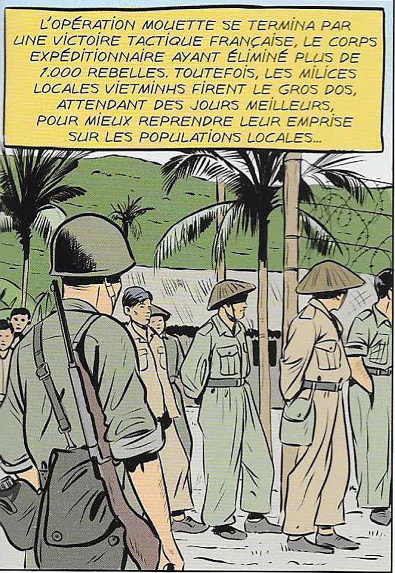 Mais ces fortifications n’empêchent pas l’infiltration d’unités vietminhs dans le delta : la 320e division vietminh citée dans la case 4 page 8 est dans ce cas. Il faut savoir que les combattants vietminhs de l’APV (Armée Populaire du Vietnam) sont organisés en trois types d’unités : les troupes locales qui défendent leur village et ses alentours, les troupes régionales qui ont une zone d’action plus large et les unités du corps de bataille qui sont équivalentes à celles de l’armée française. De plus, elles se fondent dans la population du delta du fleuve Rouge, qui est une des plus denses du monde. C’est pour ça que le chiffre de 1000 combattants éliminés mentionné page 24, n’est pas significatif d’un affaiblissement du Vietminh dans cette région. La preuve quelques mois plus tard, durant la bataille de Ðiện Biên Phủ, où l’on retrouve d’autres divisions vietminhs infiltrées dans le delta.