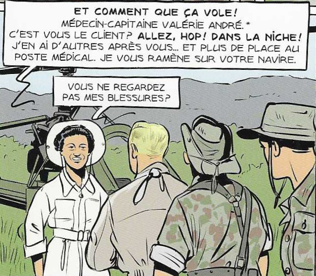 Valérie André apparaît dans le tome 4 d’Indochine où elle est copilote d’Armand Baverel sur un Sikorsky. Née en 1922, cette strasbourgeoise sera médecin, parachutiste et pilote d’hélicoptère en Indochine. Elle sera la première française à porter les étoiles de générale en 1976. Elle prend sa retraite en 1981 avec le grade de médecin général inspecteur (générale de division).