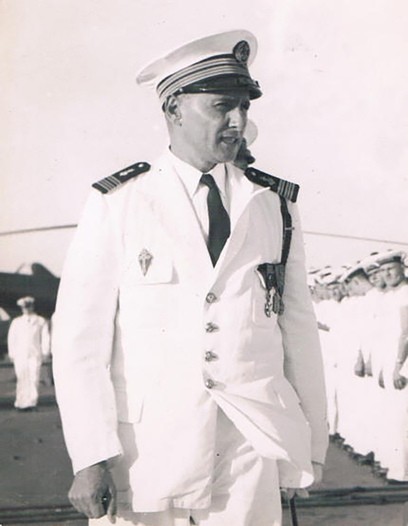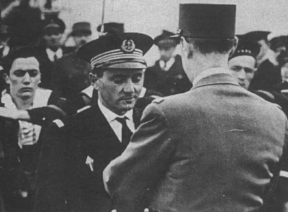 André Patou, jeune officier de marine, rejoint la France libre dès août 1940 à Alexandrie. Il commande le torpilleur La Combattante, qui amène le 14 juin 1944 de Gaulle en Normandie. Le 12 juin 1945, il est fait compagnon de la Libération par décret. Il commande l’Arromanches du 29 aout 1953 au 14 octobre 1954 (photo 2 et page 43). Il termine sa carrière comme amiral et chef d’état-major de la Marine de 1968 à 1971.