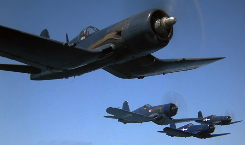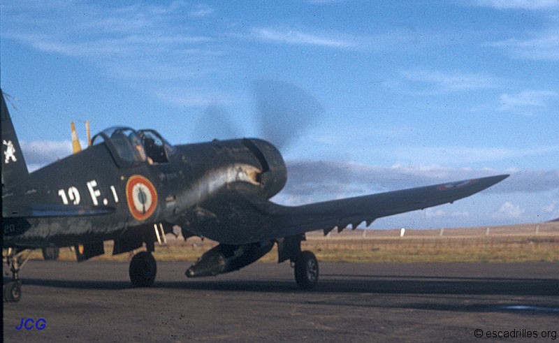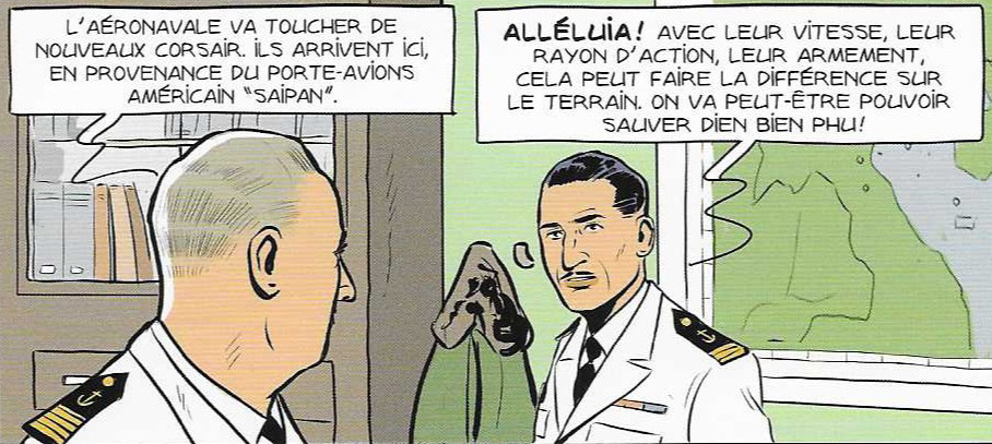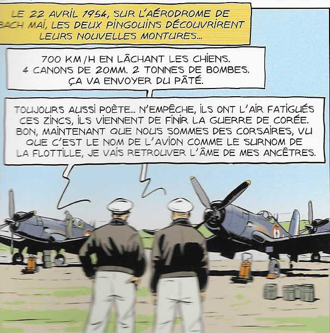 De la page 43 à la fin de l’album, la flottille est équipée de Chance Vought F4U Corsair qui est le chasseur embarqué américain de la Seconde Guerre mondiale, dont la silhouette caractéristique est mondialement connue grâce à la série TV Les Têtes brulées (photo 1). La photo 2 le montre aux couleurs de l’Aéronavale française. Comme le signale les deux cases ci-dessous de la page 43, les Corsairs furent accueillis avec enthousiasme et un optimisme parfois excessif par les pilotes de notre escadrille 1F . Tous les appareils de ce type sont retirés du service en 1968.