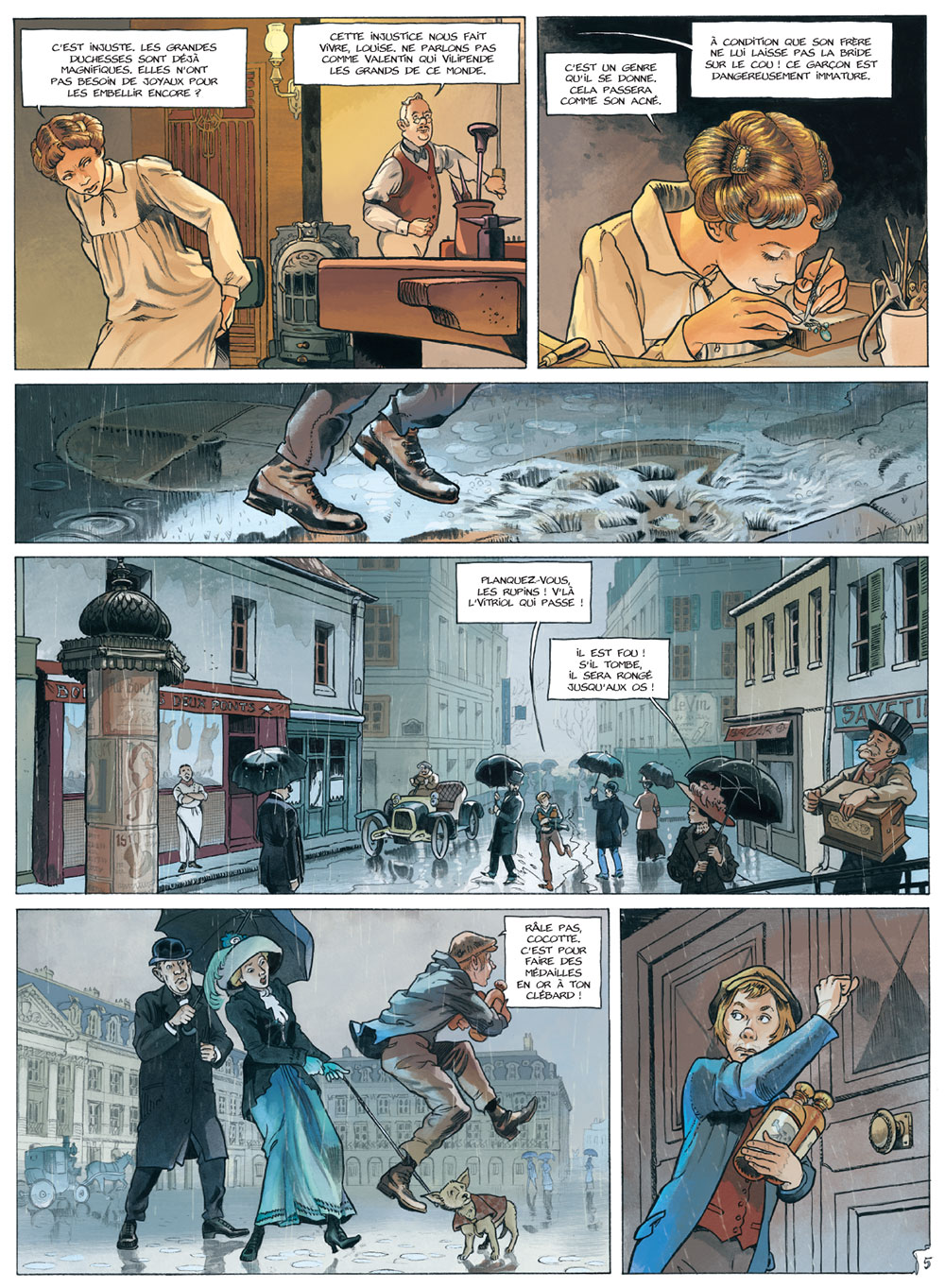 Ils ne savent pas encore que Paris va vivre sa pire crue depuis 1658. Mais pour l’heure, monsieur Morchard, n’en a cure. Cet ancien capitaine de l’armée coloniale –les « Bats d’Af », désormais chef d’atelier chez le joaillier Verne, place Vendôme, livrera bientôt à l’ambassade de Russie cinq croix commandées pour les enfants du Tsar. Il est fier d’avoir tenu les délais. Il est ému du travail magnifique de Louise, sa fille adoptive. Il est enfin satisfait d’avoir pris sous son aile, comme apprenti, le jeune Valentin, frère cadet d’un ancien caporal des « Bats d’Af » qui s’est conduit en héros sous ses ordres à Mostaganem. Après une dure journée de labeur, chacun rentre chez soi. Pour aller jusqu’à Vincennes, Louise va emprunter le métropolitain. Dans un compartiment de première classe, elle est théâtralement accostée par monsieur Delaroche, faux aristocrate, vrai pianiste au Moulin Rouge, expert dans l’art de la boxe française, et bien plus encore…