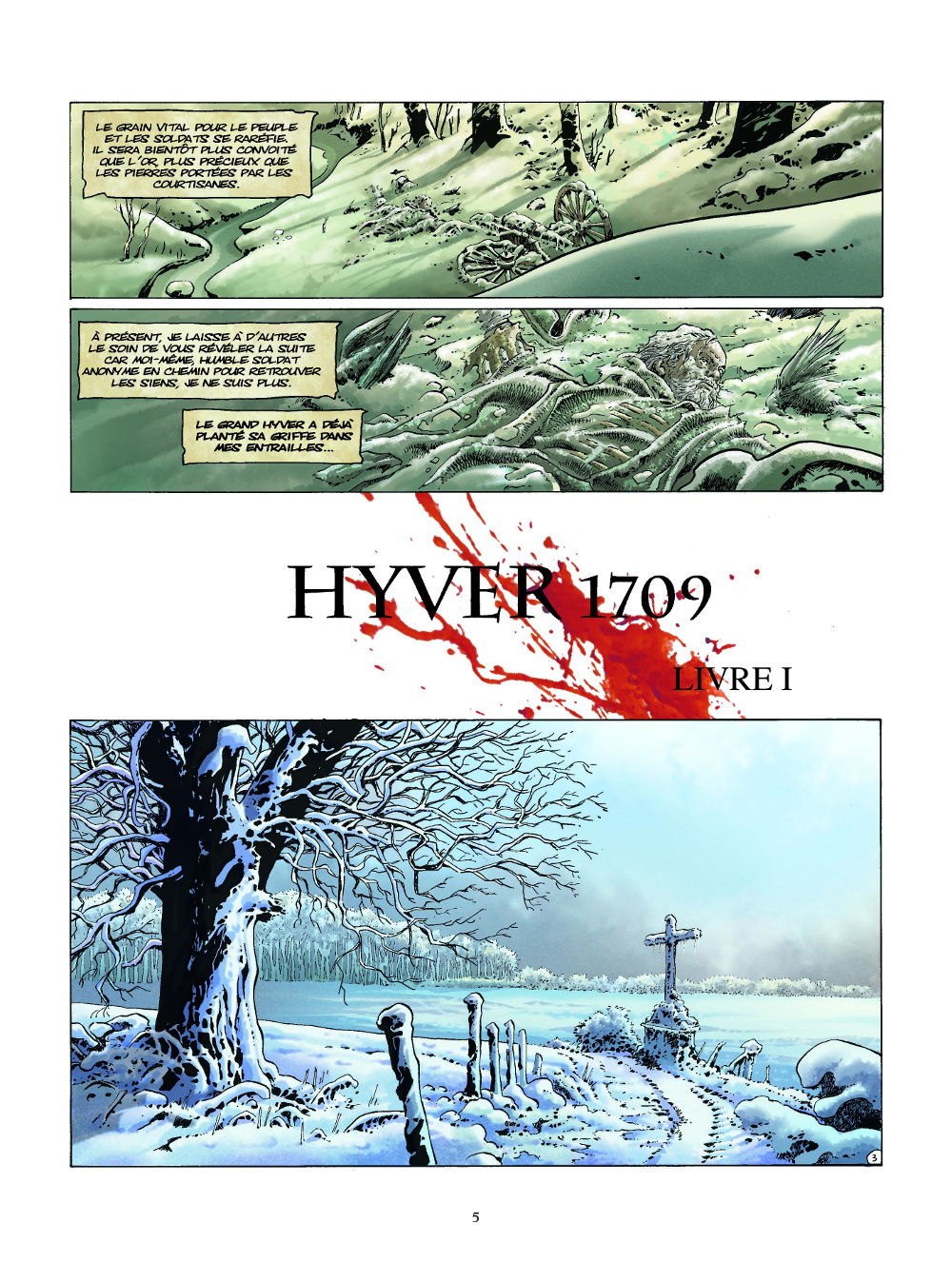 Comme précédemment pour Croisade ou Conquistador, le diptyque Hyver 1709 se présente avant tout comme un récit d’aventure dans un contexte historique. Un cocktail somme toute assez classique, qui fait ses preuves depuis plus de trente ans. Le principal avantage de la formule étant d’éviter les récitatifs interminables et les longues explications de texte parfaitement indigestes (ce que certains auteurs et éditeurs ne semblent toujours pas avoir compris). Ce premier tome présente un bon équilibre entre la nécessaire contextualisation des événements, et une chasse à l’homme assez surprenante ; le décor enneigé aidant. L’intrigue n’est jamais figée, le héros toujours en mouvement, et la mort omniprésente, ne serait-ce que sous la forme de congères trompeuses. Philippe Xavier confirme qu’il est actuellement l’un des meilleurs dessinateurs de BD historique, même si certaines scènes d’action, que l’auteur voulait dynamiser par un découpage saccadé, manquent paradoxalement de lisibilité (3). Mention également pour les couleurs de Jean-Jacques Chagnaud, qui nous font littéralement grelotter de froid.