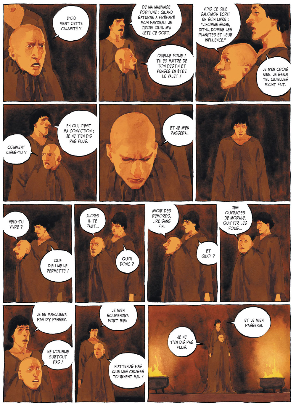 Sa faculté à donner à ses personnages des attitudes variées et d’une grande justesse expressive donne au lecteur une porte d’entrée grande ouverte à l’identification. Et l’une des grandes réussites des trois albums est justement de prendre le lecteur par la main pour mieux lui faire vivre des sensations contradictoires. Au fil des volumes, la sympathie que ce dernier éprouve pour François Villon est mise à rude épreuve tellement les actes du poètes sont parfois difficilement défendables, voire même parfaitement méprisables. Comment alors suivre un personnage principal si celui-ci vous dégoûte ? C’est à ce type de cas de conscience que l’on est confronté à la lecture de Je, François Villon. Faire ressentir de tels sentiments à ses lecteurs n’est pas donné à n’importe quel auteur. C’est le cas pour Luigi Critone.