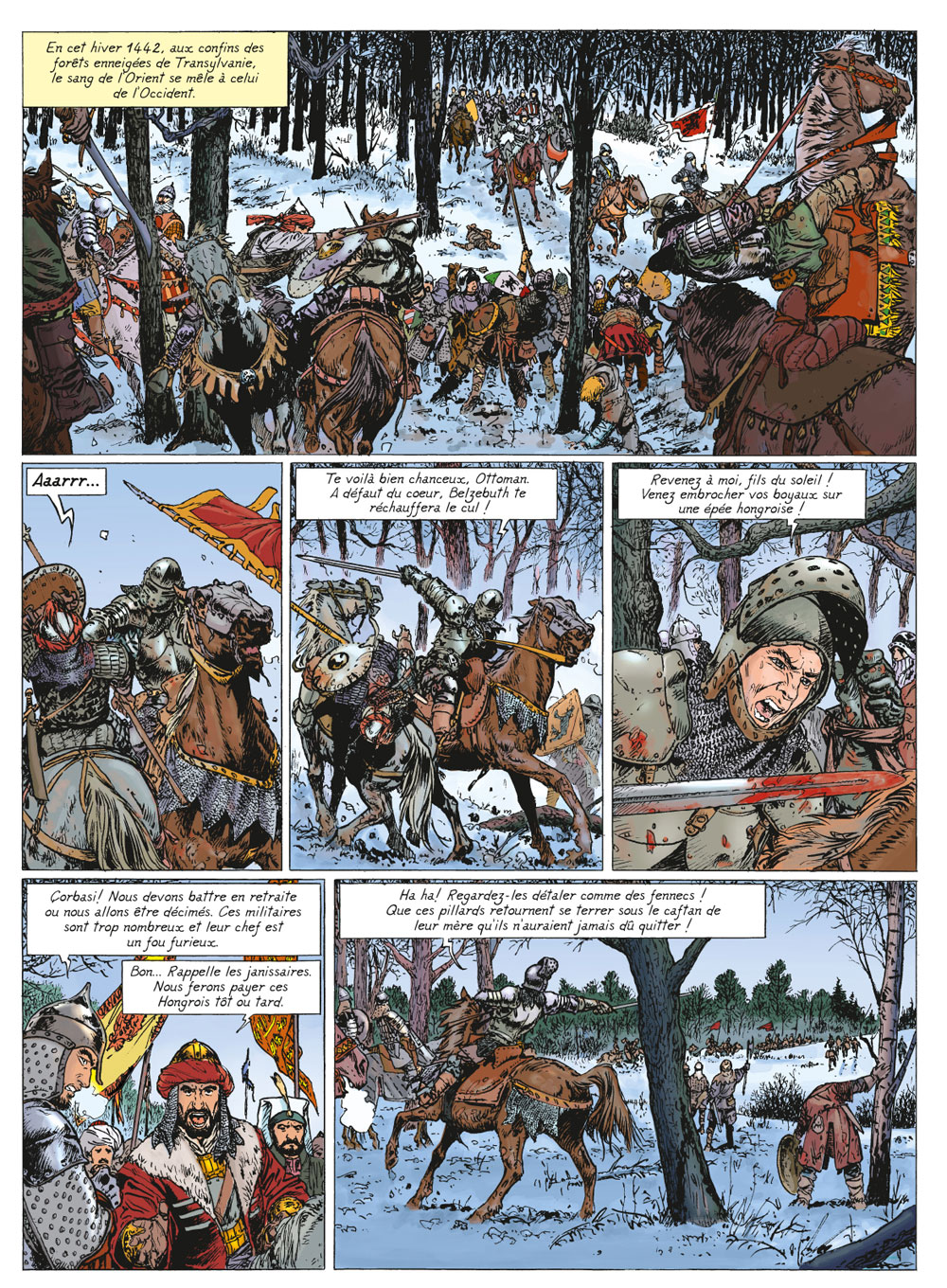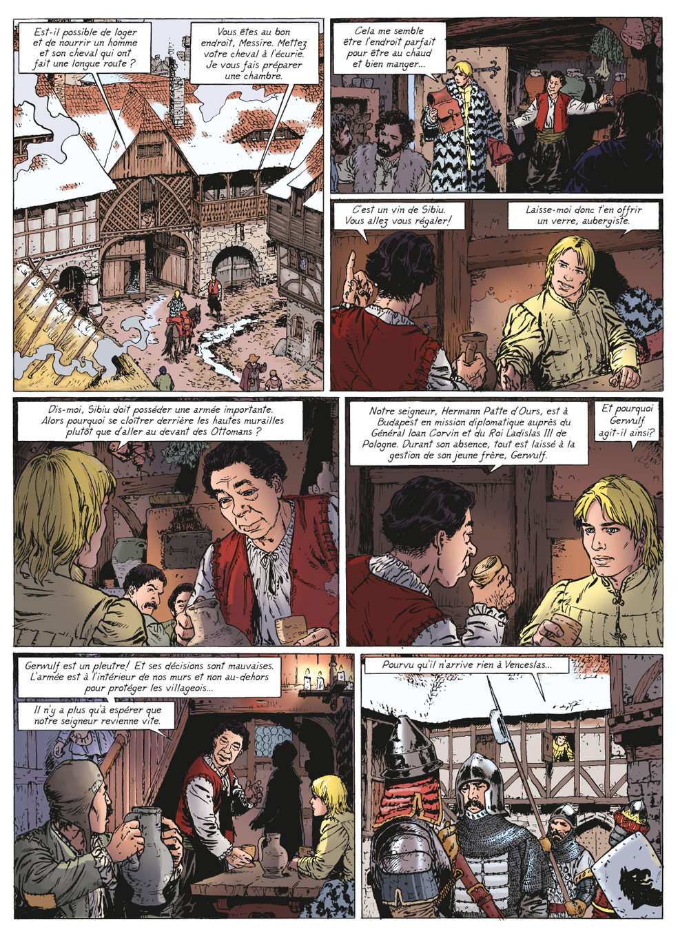 Ladislas III est désavantagé par son jeune âge, mais il s’appuie sur un soldat professionnel, Jean Huniyadi, ici désigné par l’aubergiste sous son nom latin de Ioan Corvin. Voïvode de Transylvanie, Jean soutient l’autorité de Ladislas, qui le nomme commandant de Belgrade et chef militaire de la région du Bas Danube. Le titre évoqué ici, “général”, est évidemment un anachronisme, Ioan Corvin étant officiellement “capitaine des parties inférieures” – comprenons des parties sud du pays. Corvin prône une stratégie plus agressive contre les Turcs, stratégie qui est plusieurs fois couronnée de succès ; on peut penser que la “mission diplomatique” évoquée ici renvoie à la préparation de la campagne du printemps. Quelques semaines seulement après l’histoire racontée dans cette bande dessinée, Corvin remporte une grande victoire sur les Ottomans, tout près de Sibiu – c’est la bataille d’Hermannstadt, livrée en mars 1442. Quelques semaines plus tard, il remporte une autre victoire importante dans le défilé des Portes de Fer, où se passe l’action de la bande dessinée.
