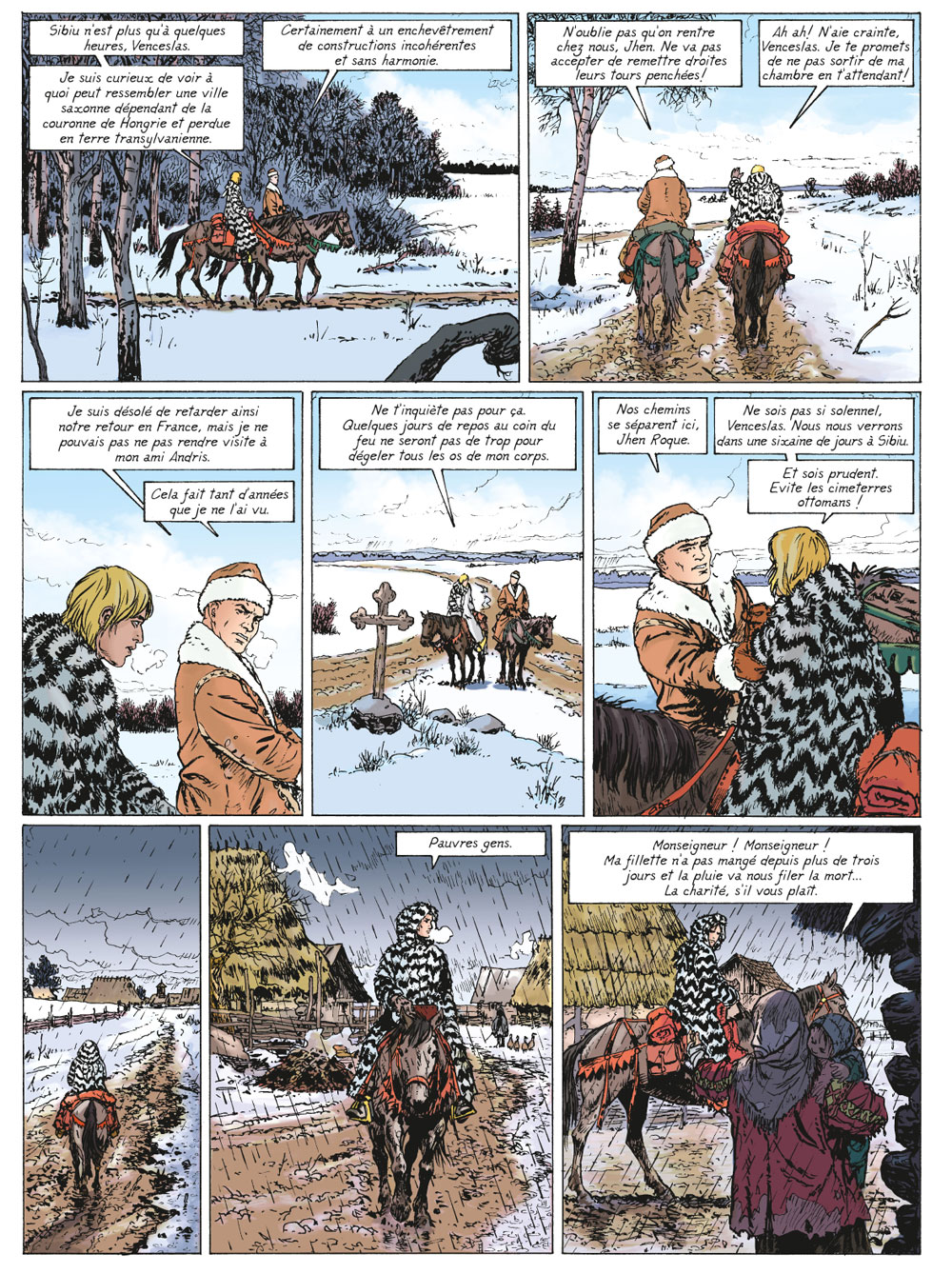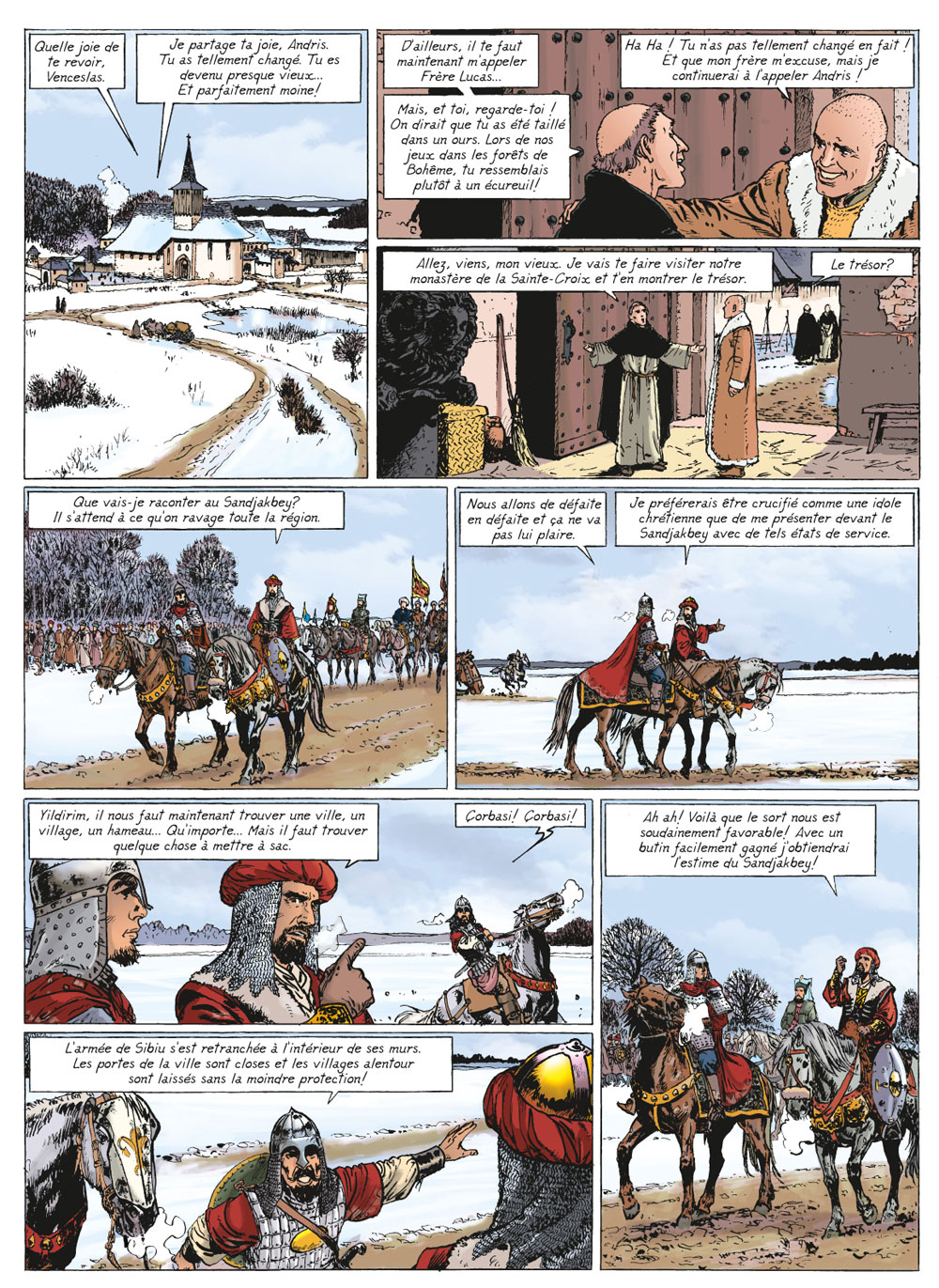 La ville est presque entièrement détruite lors des attaques mongoles de 1241-1242, mais elle est rapidement reconstruite. Au XVe siècle, époque à laquelle se déroule l’album ici commenté, c’est probablement la plus grande cité de Transylvanie. Face à la menace ottomane, la ville se dote d’une triple enceinte, une puissante fortification à laquelle l’image ne rend pas justice. Plusieurs fois assiégée par les Turcs, Sibiu ne fut jamais prise, ce qui lui valut le surnom, attesté notamment dans la correspondance pontificale, de “bastion de la Chrétienté”. Vu l’importance économique et politique de la cité, la route n’est pas bien représentée ici : si les routes pavées restent extrêmement rares, on observe néanmoins, surtout à partir de la fin du XIIIe siècle, une tendance à aller vers des routes plus larges, souvent empierrées. En revanche, l’architecture globale est très bien rendue, avec ce souci du détail qui caractérise l’œuvre de Jacques Martin et de ses continuateurs.