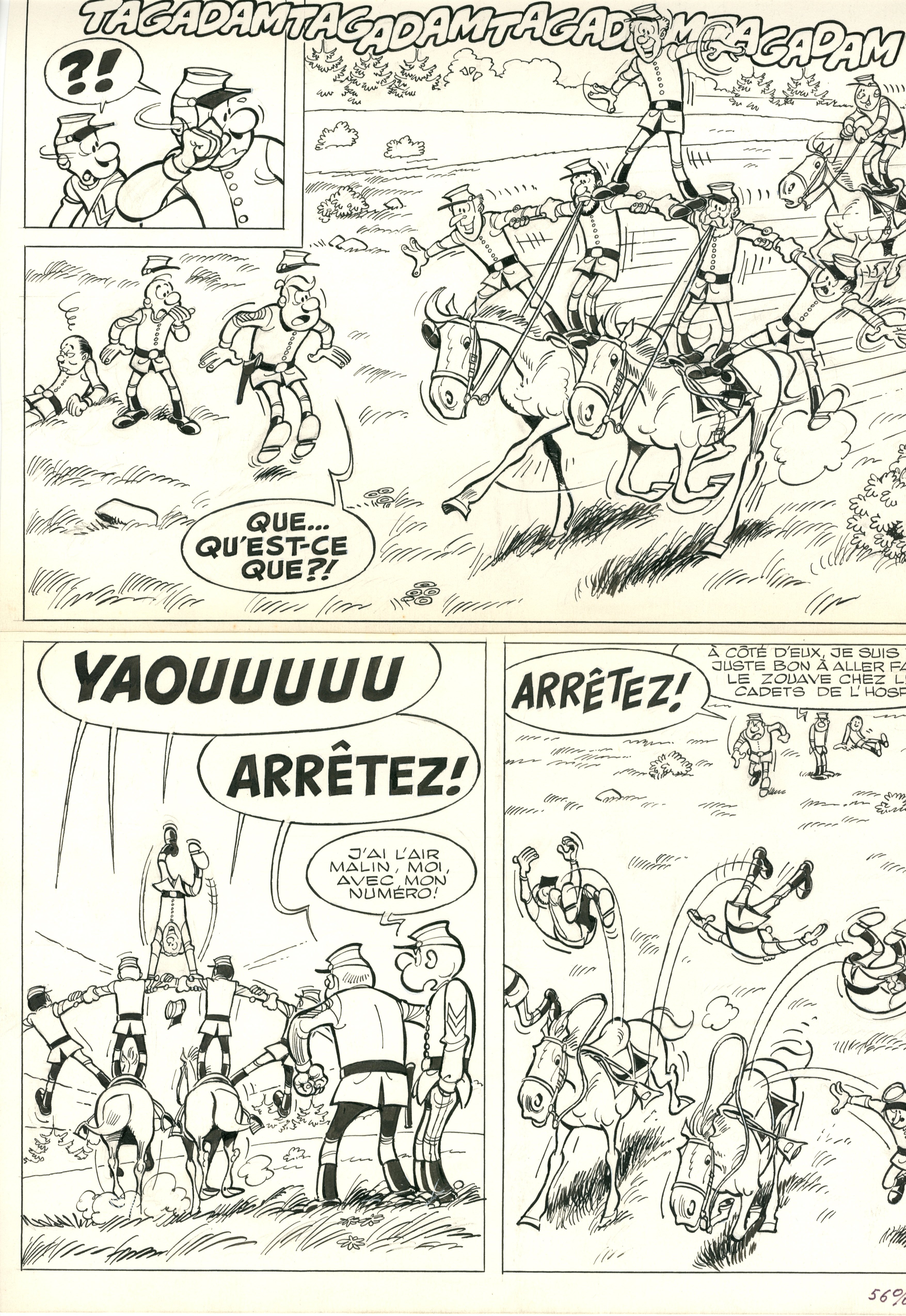 Les Tuniques bleues paraissent pour la première fois en 1968 dans le journal Spirou, Louis Salvérius est au dessin et Raoul Cauvin au scénario. Dès le début, cette série prend un ton humoristique, pacifiste et antimilitariste qui n’a pas varié avec le temps. La Guerre de Sécession (1860-1865), le conflit dans lequel évoluent les deux héros, est encore une guerre où les chevaux sont omniprésents. Le Musée de cheval du Château de Chantilly a décidé de présenter une sélection de 23 planches originales dans lesquelles Lambil a mis en scène le cheval. Les races, les équipements, les charriots, les jeux, la guerre, etc., la commissaire d’exposition a choisi une quinzaine de thèmes qui résonnent avec les objets présentés dans le musée. L’occasion est belle de découvrir les planches originales car si la série est décriée et moquée depuis quelques années (le tout étant à relativiser car le tirage moyen des derniers volume avoisine 100 000 exemplaires), on voit que le dessin de Lambil n’est pas pour rien dans le succès des Tuniques bleues.