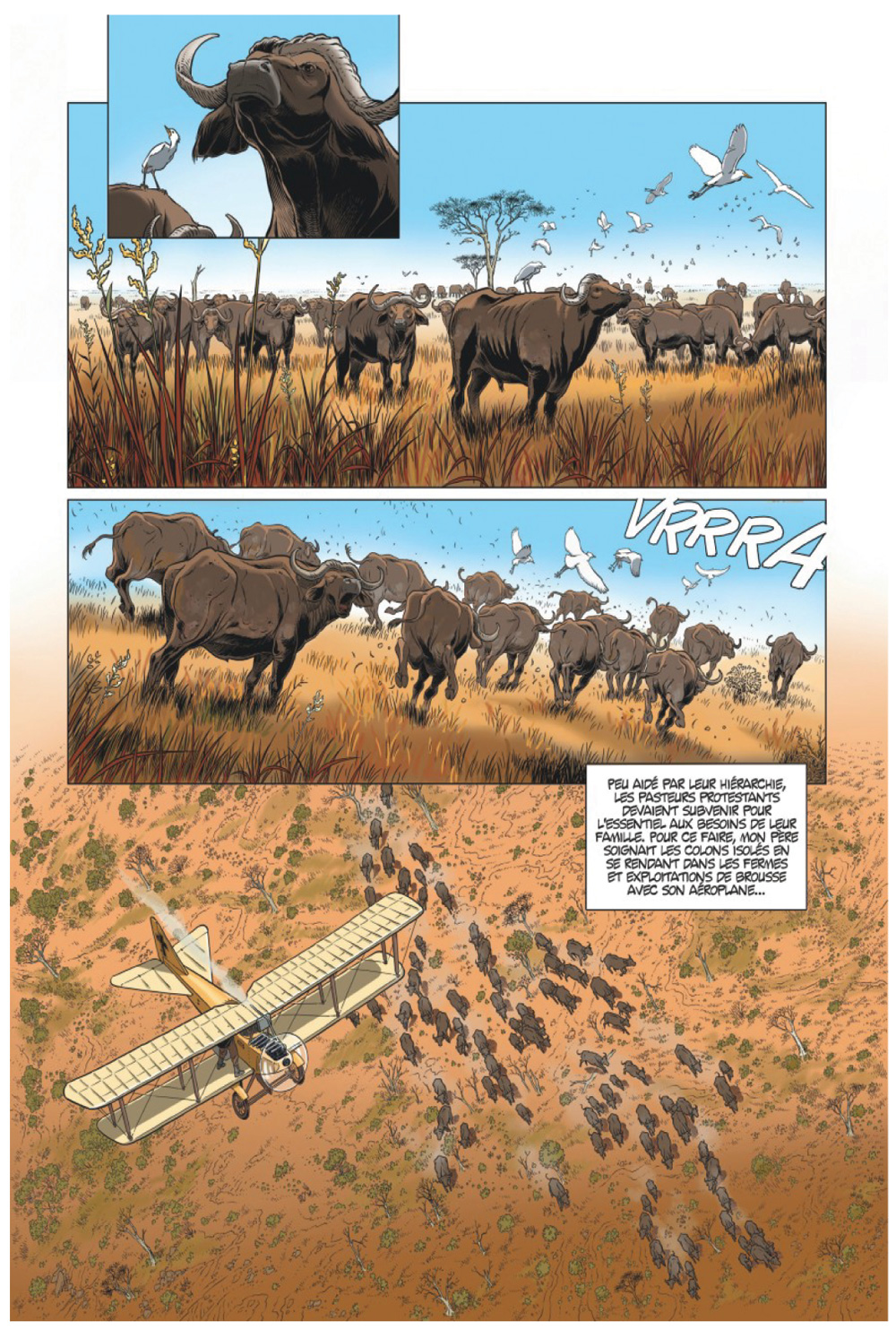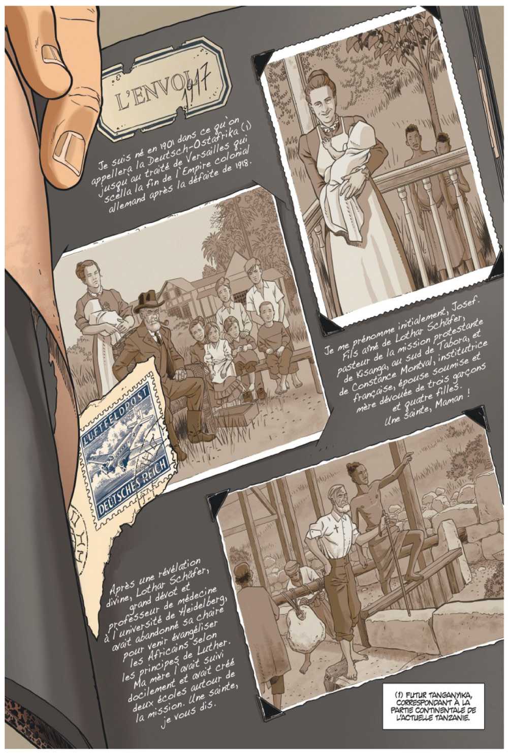Pour ceux qui douteraient encore de la pertinence de l’appellation Première Guerre mondiale, le premier volume de la série L’Aviateur peut servir à dissiper la moindre ambiguïté. L’action de ce tome 1 intitulé L’Envol se déroule en effet en 1917 au fin fond de l’Afrique orientale allemande (aujourd’hui la Tanzanie), dans le minuscule village de Kisanga, à des milliers de kilomètres des fronts européens. Toutefois, l’éloignement extrême du cœur du conflit n’empêche pas les habitants de cette région africaine d’être concernés par la guerre. La colonie allemande, dont la superficie atteint au début du XXe siècle 1 000 000 de km² pour 7 700 000 habitants (dont 5 000 européens), est une proie de choix pour les puissances coloniales qui l’entourent. Le Royaume Uni, la Belgique et le Portugal forment donc une Triple-entente pour ne faire qu’une bouchée du voisin germanique. Les forces en présence sont effectivement disproportionnées. D’un côté, des centaines de milliers de combattants, une force navale conséquente et une force aérienne, certes balbutiante mais tout de même dominatrice. De l’autre, 260 Allemands et 2472 askaris des Schutztruppen (soldats indigènes), ainsi qu’un bateau à roues à aubes, un remorqueur, une canonnière et le croiseur léger SMS Königsberg. Même si ces effectifs sont multipliés par dix en un an, le déséquilibre est évident. Et malgré cela, les troupes allemandes que commande le lieutenant-colonel Paul Emil von Lettow-Vorbeck parviennent à tenir tête à leurs ennemis.