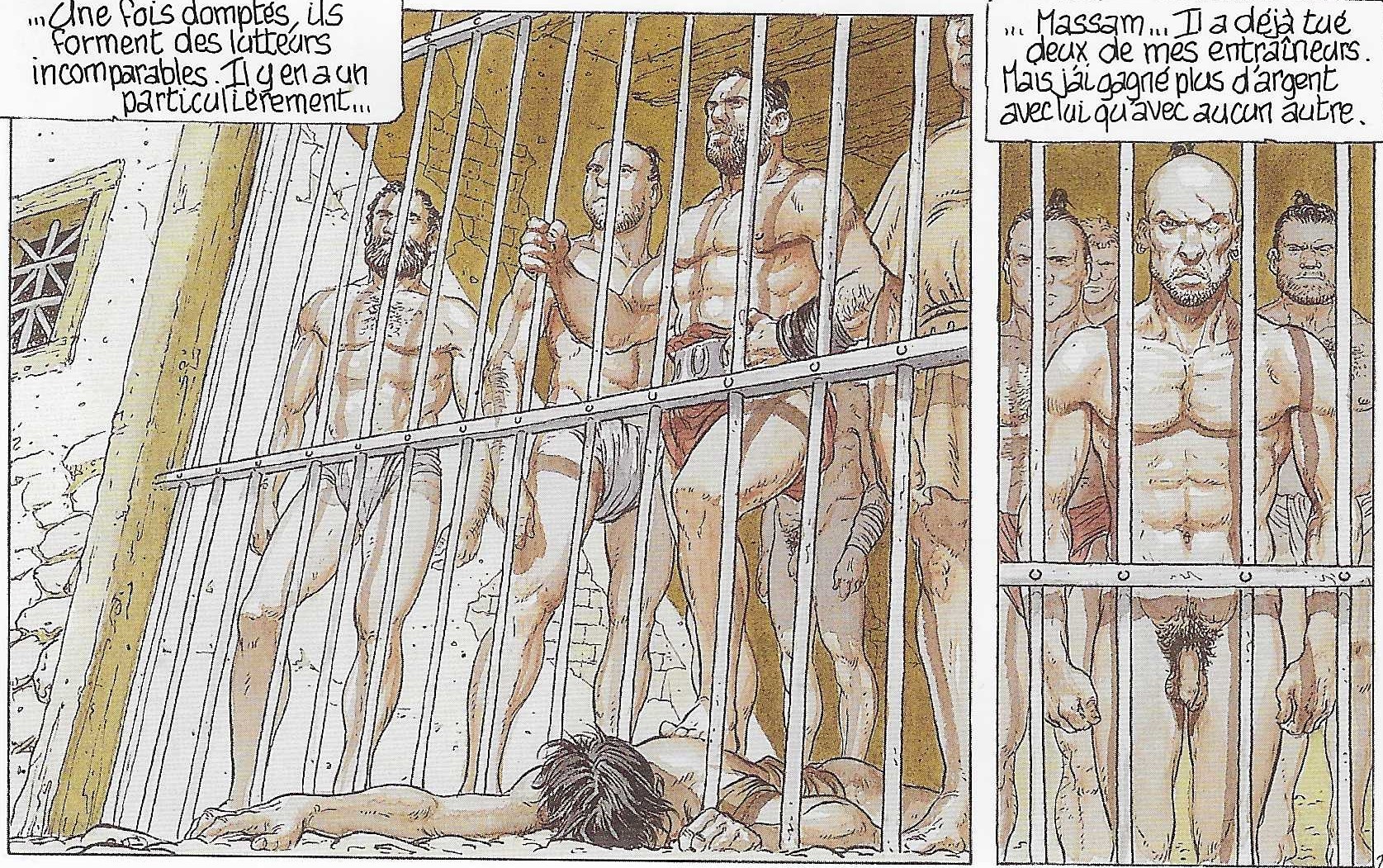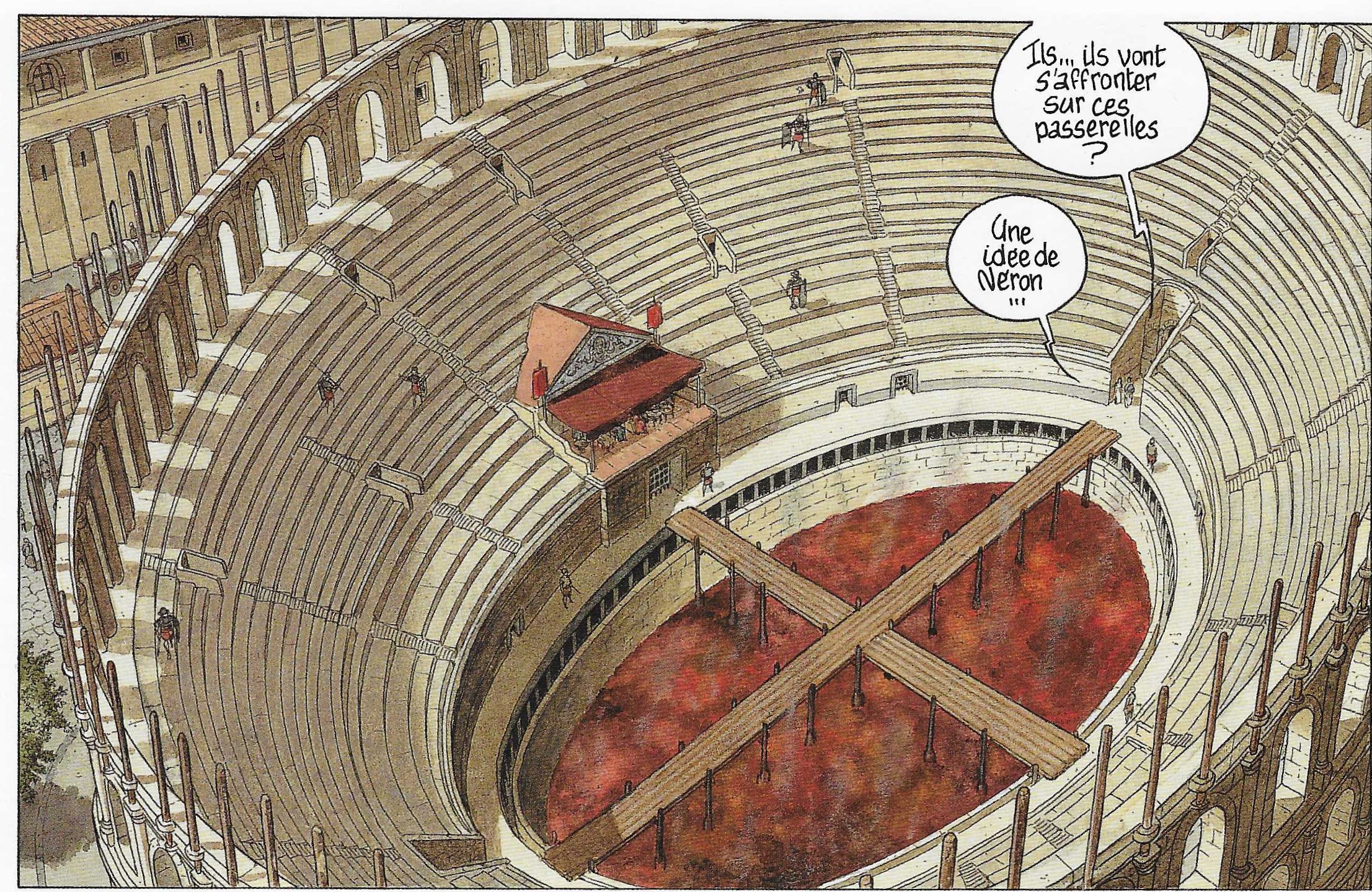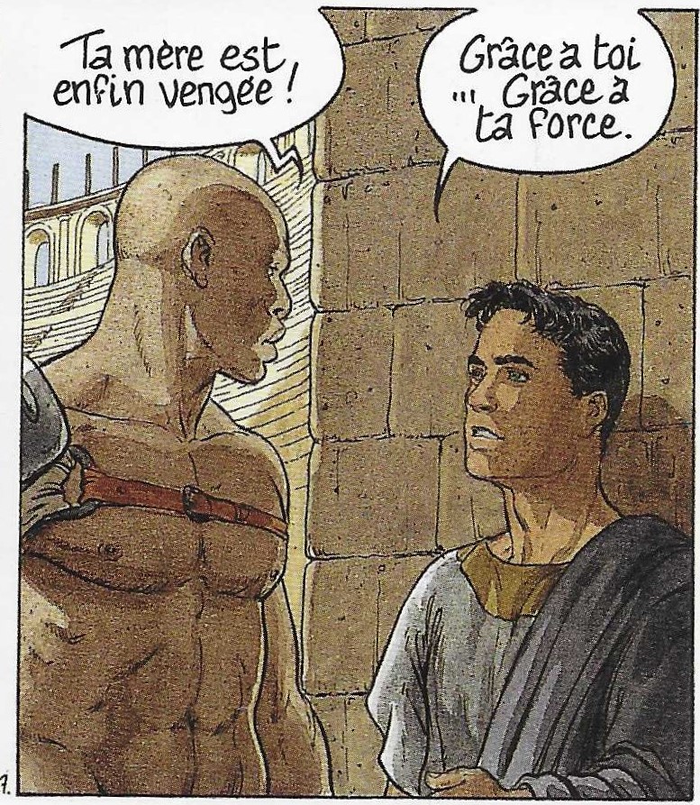 En revanche, dans la série Murena, les gladiateurs interviennent très fréquemment, comme hommes de main mais pas dans l’arène. Pourtant la série y démarre : à la case 1 de la page 1 du tome 1 La Pourpre et l’or, on peut voir l’empereur Claude dans sa loge.