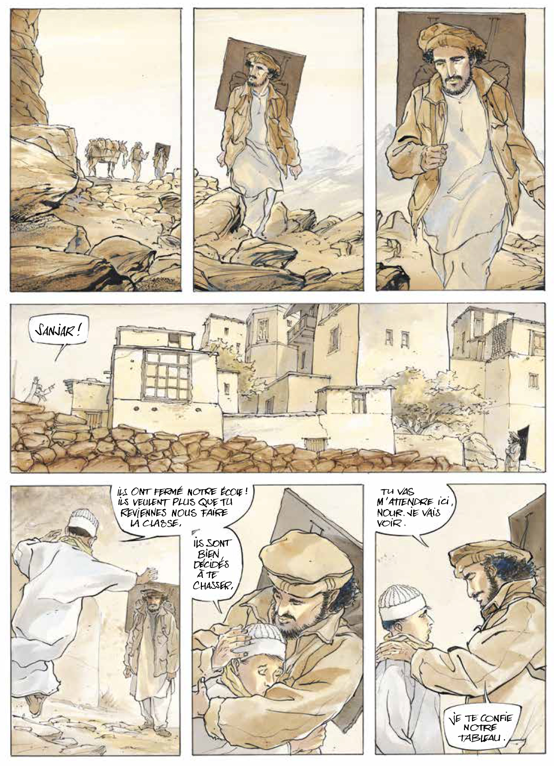C’est le troisième acte de l’album et une sorte de boucle scénaristique puisque son « fixeur » Sanjar (celui qui traduit, s’occupe des rendez-vous et de sa sécurité) n’a pas toujours exercé cette activité. C’est la progression des talibans qui l’a éloigné de son métier, instituteur itinérant pour les écoles de montagnes de la région du Pandjichir ! Arizona et Sanjar mènent tous deux un combat, combat différent mais au nom des mêmes valeurs. Arizona veut faire bouger la législation des États-Unis sur les armes et le conservatisme de cette Amérique où Trump vient de triompher, tandis que Sanjar veut permettre à tous d’accéder à une éducation qui libère l’esprit, loin du carcan religieux de la tradition. On suit le combat de Sanjar à travers de superbes pages de paysages où se mêlent grande et petite histoire : rencontres avec les femmes afghanes qui continuent vaille que vaille de lutter pour l’éducation des filles, dont Eshani Alam, seule femme juge à la cour suprême d’Afghanistan (il y a bien eu de rares femmes à ce poste mais elles ont fini assassinées… ).
