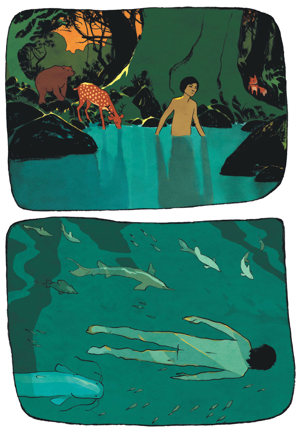 Anne-Caroline Pandolfo et Terkel Risbjerg viennent tous deux de la littérature jeunesse, et cette interprétation de la légende de Perceval s’en ressent. De fait, ils s’adressent ici à l’enfant qui est en nous pour nous faire rêver de ce monde magique et hors temps où la recherche du Graal est moins une recherche d’éternité qu’une quête d’identité.