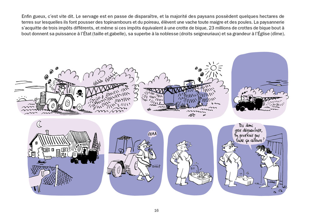 GJ : L’idée de ce livre est de faire cohabiter deux récits : dans le texte, l’histoire de la Révolution française de 1789, documentée, racontée avec humour et de manière chronologique, dans le dessin, une révolution qui aurait lieu dans un futur très très proche, avec des problématiques communes. On a donc deux espaces-temps qui permettent de dire : « la Révolution française racontée à ceux qui vont faire la prochaine ».