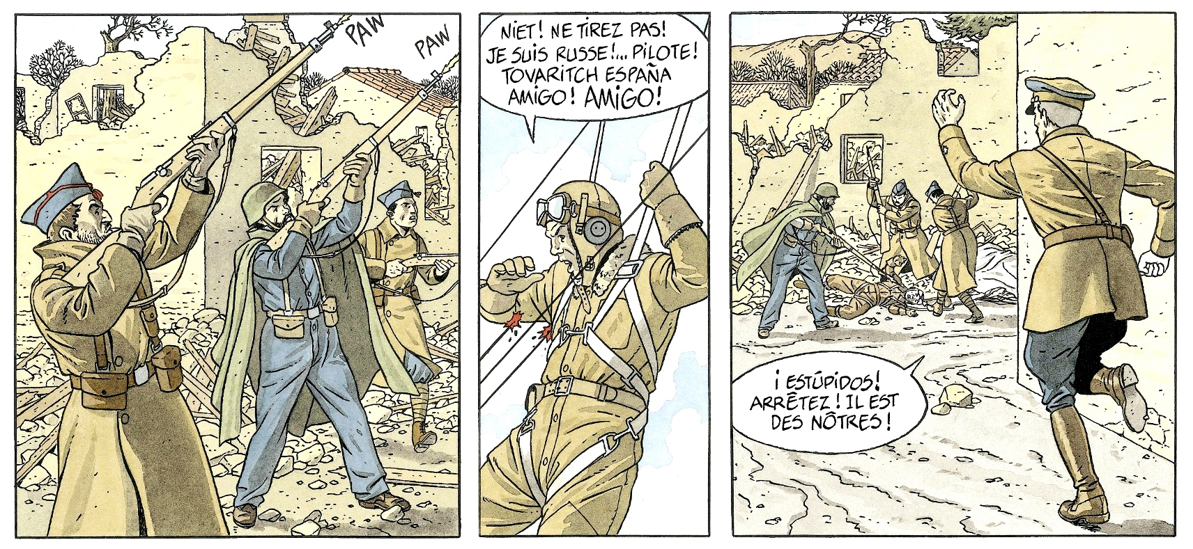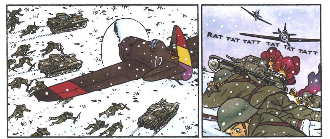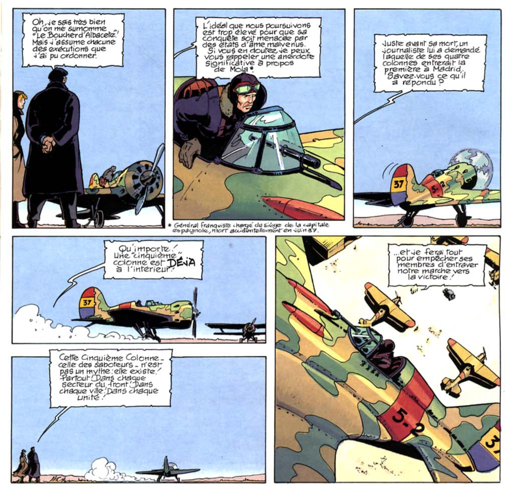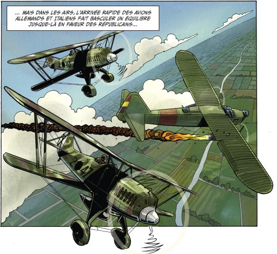 Durant ces six premiers mois de la guerre civile, l’arme aérienne a fait montre de son rôle fondamental tant en ce qui concerne le bombardement, les attaques au sol que le transport rapide. Sur ce terrain-là, les républicains sont rapidement en difficulté. C’est ce qui est évoqué dans la dernière case de la page 3, où l’on voit deux chasseurs allemands Heinkel He-51 aux couleurs franquistes descendre un bombardier Potez 540 livré par la France aux républicains. Cette situation est également bien racontée dans l’opus de Gerardo Balsa, L’ombre du Condor, 1936 Duel sous le ciel d’Espagne sorti en septembre 2019 aux Éditions du long bec, qui a l’avantage d’avoir en fin d’album quatre planches de fiches techniques des avions présents en Espagne durant cette période.
