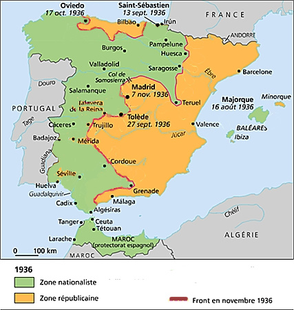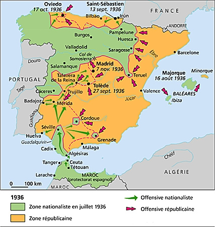 Quand les premiers I-16 soviétiques arrivent en Espagne en novembre 1936, quelle est la situation militaire ? Au Sud, après avoir franchi le détroit de Gibraltar grâce au pont aérien organisé par l’aviation allemande et italienne, les troupes franquistes se sont emparées de Séville et ont désenclavé Grenade et Cordoue. Elles sont ensuite remontées vers le Nord en suivant la frontière portugaise. Elles ont ainsi fait leur jonction avec les forces du Nord, qui entre-temps avaient isolé de la France le Pays basque républicain. Ainsi réunies en un seul bloc, les forces franquistes concentrent leurs efforts sur Madrid, qui est atteinte début novembre 1936. La ville, encore aux mains des républicains, s’apprête à soutenir le choc.