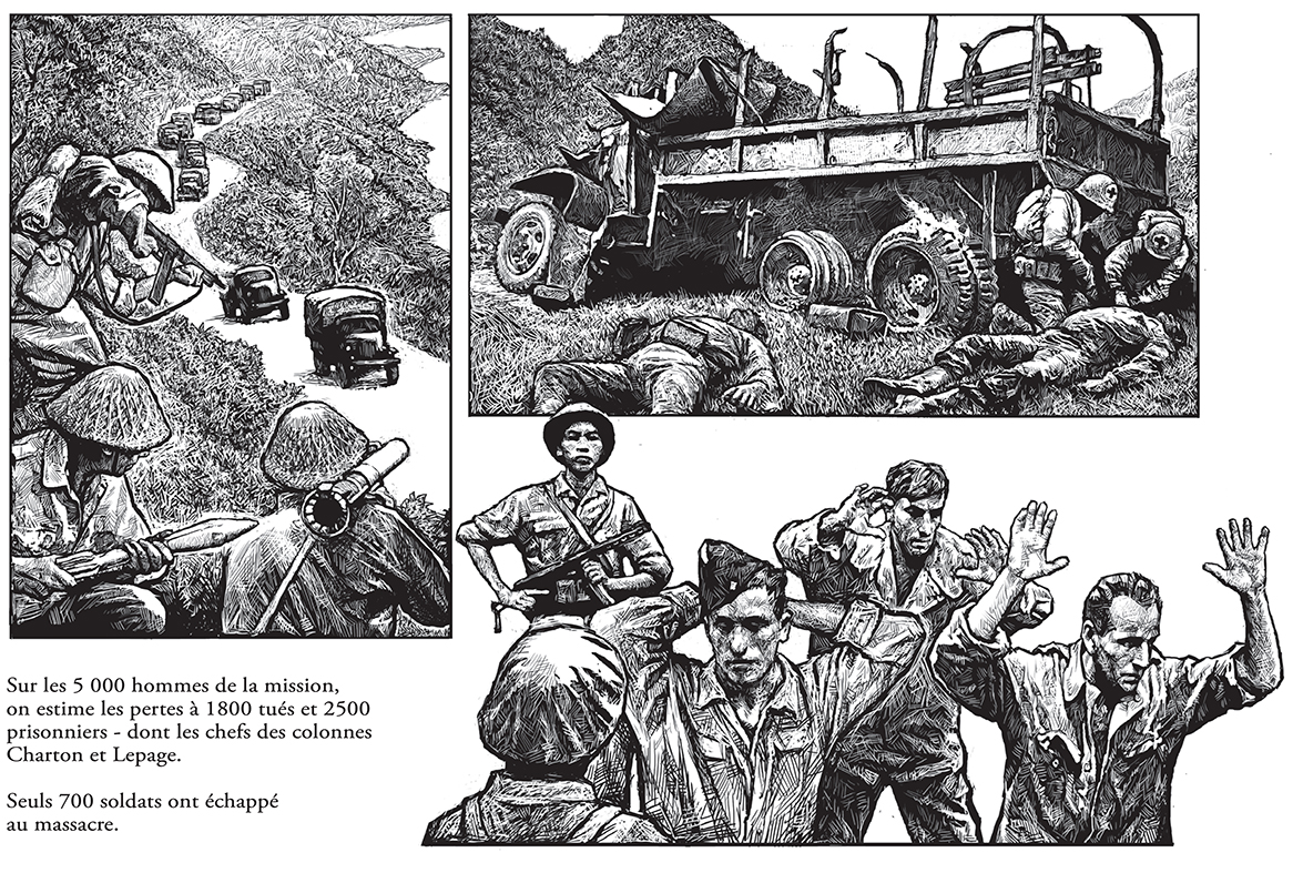 L’album décrit la défaite française de la bataille de la RC4 en 1950 (qui oppose le CEFEO au Viet Minh dans le nord Tonkin, ci-dessous p.51). Puis à partir de 1951, le redressement sous le général de Lattre (ci-dessous p.61). Ensuite la dernière victoire française, celle de Na San (ci-dessous p.73). Et pour terminer la tragique défaite de Dien Bien Phu (ci-dessous p.98). Au vu du nombre important d’images qui concernent ces combats, il apparaît certain que François du Sorbier a couvert ces événements, comme tout journaliste résidant en Indochine. Mais du fait de son appartenance à l’AFP, la plupart de ses articles n’ont pas dû être signés, ce qui était la règle pour les correspondants de cette agence de presse.