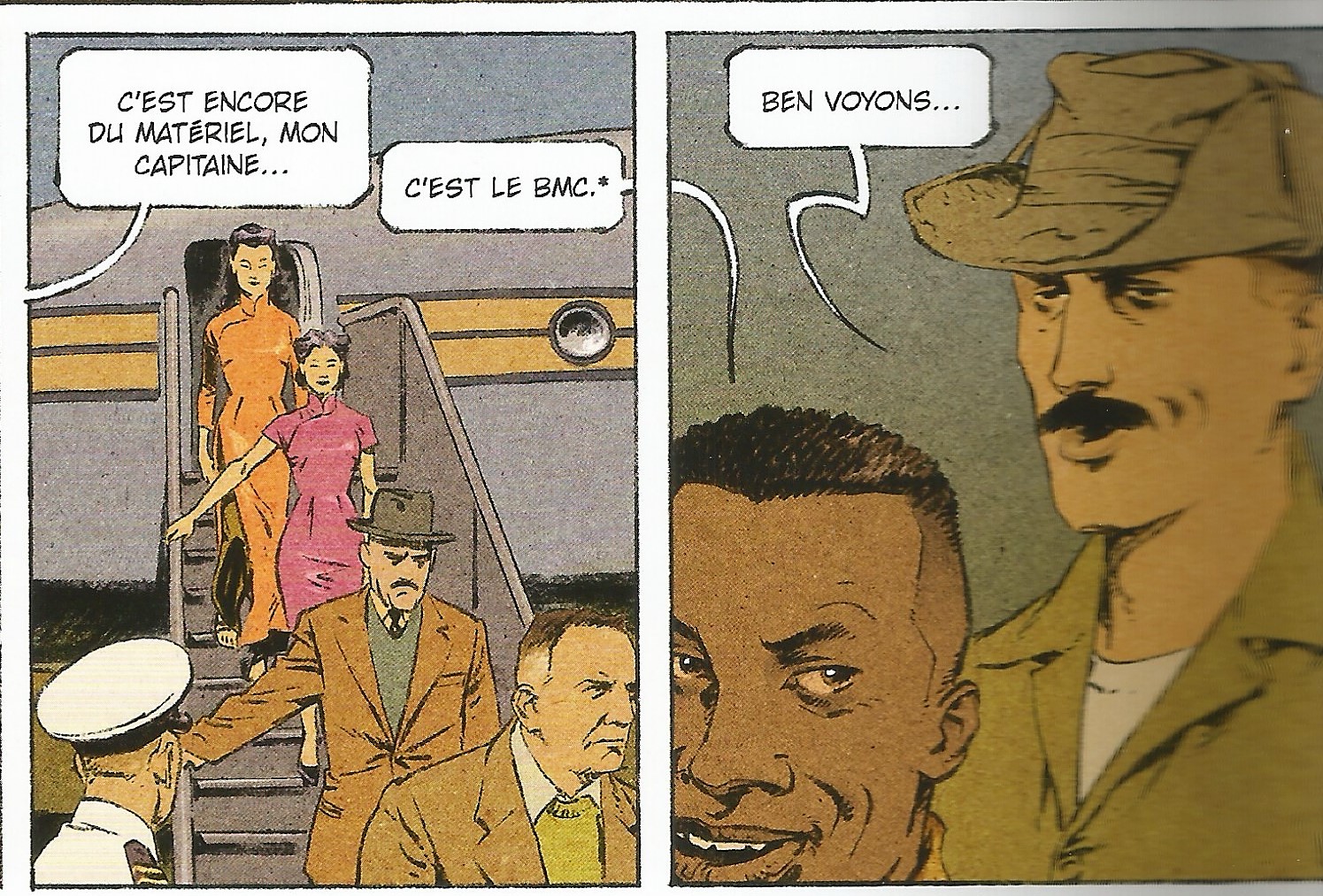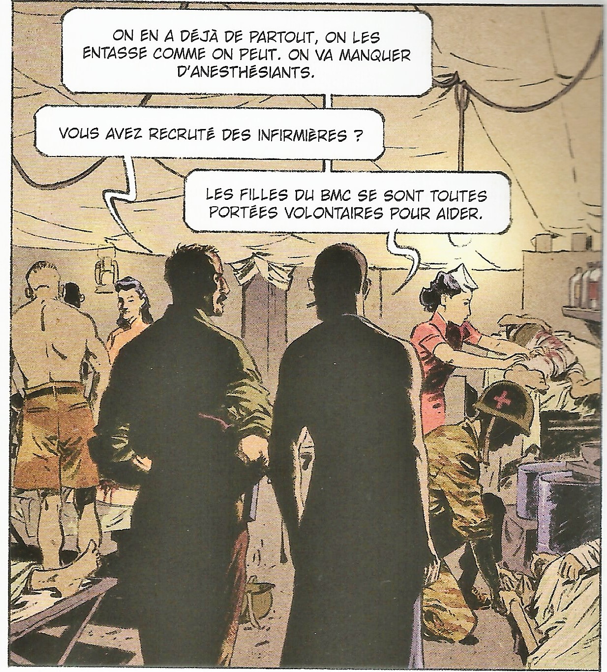 Parmi ces souvenirs d’un journaliste en Indochine, il n’y a pas que de la violence des combats ou la complication des scandales politiques ou financiers. D’autres sujets sociaux ou culturels sont abordés. Le problème de la prostitution est évoqué à la fois sur un plan moral et médical. Selon la légende, certaines prostituées du « parc aux buffles » savaient dire « dépêche-toi » en huit langues différentes. Cet aperçu se termine par la case ci-dessous rappelant l’importance de la prostitution pour le moral des troupes en campagne. Dans l’album intitulé Rendez-vous avec X-Vietnam 1954 Diên Biên Phu, sorti en 2004, nous retrouvons page 20 la même image de ces prostituées descendant de l’avion, le sigle BMC signifiant « Bordel Militaire de Campagne ». À Dien Bien Phu, les prostituées bloquées sur place par la destruction de la piste d’atterrissage devinrent d’héroïques infirmières pour les soldats blessés (idem p30).