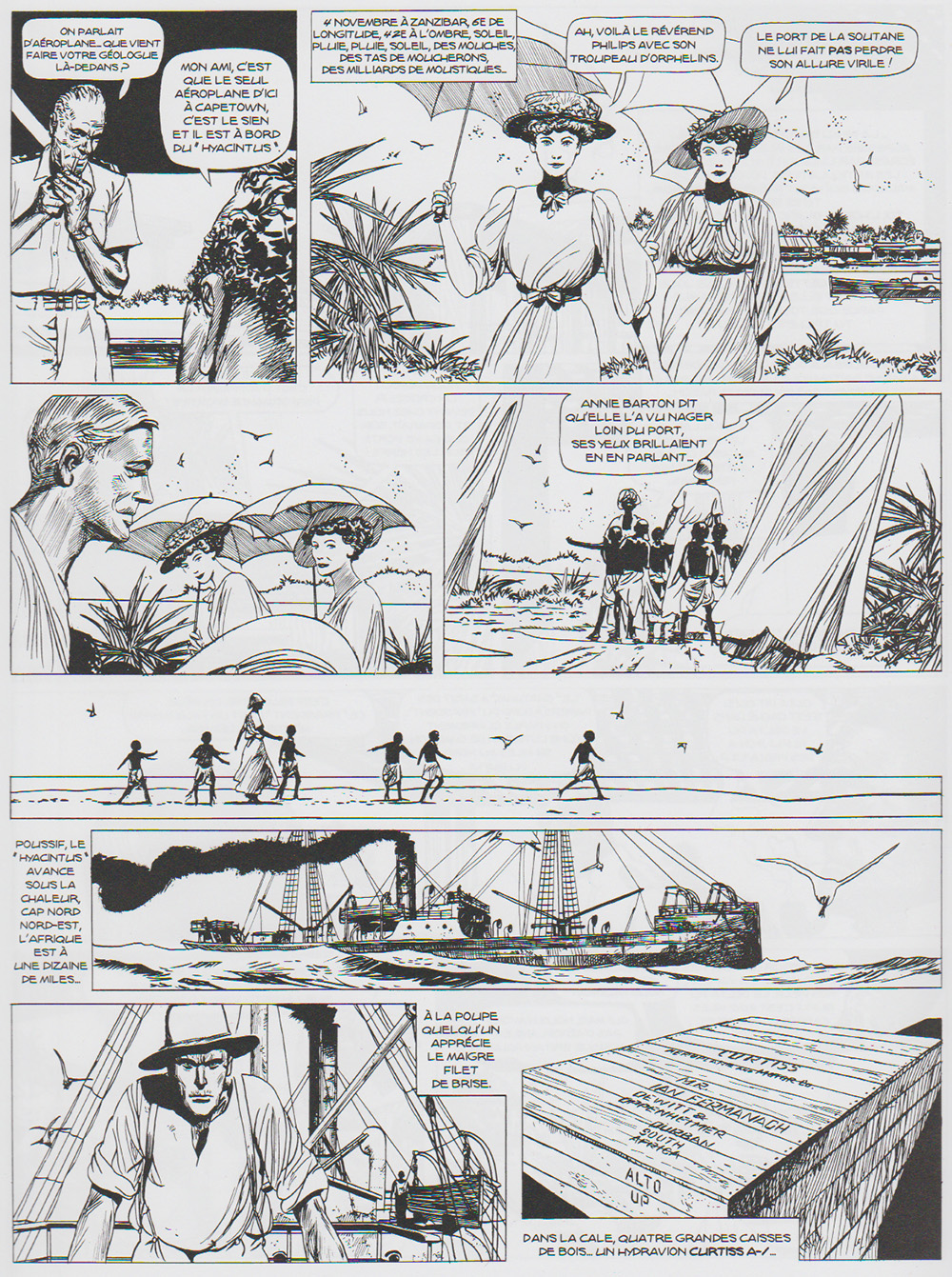 Si Micheluzzi s’empare de cet événement du début de la Première Guerre mondiale, c’est qu’en 1978, date à laquelle il réalise la bande dessinée, l’épave du Königsberg est toujours visible, prise dans la vase du Rufiji. Cette vision d’un colosse de fer disparaissant lentement dans les sables mouvants (de l’Histoire ?) a sans doute piqué la curiosité et l’imagination d’un auteur qui aimait représenter les destins tragiques et l’esprit chevaleresque. Tanganyika, dont l’action se place fin 1914 début 1915, décrit en effet un temps révolu (et fantasmé), celui des guerres conduites entre gentlemen, où le sens de l’honneur, la reconnaissance des mérites de l’adversaire et la magnanimité sont les maîtres mots. Ian Fermanagh, le pilote chargé de retrouver la trace du Königsberg au commande de son Curtiss, Theo Höppner, Kapitänleutnant sur le navire allemand, et Max Looff sont des hommes de cette trempe. Confrontés aux trahisons et mesquineries qui les entourent, ils tentent de garder le cap en cette période troublée. Au point de se dégoûter profondément quand les circonstances imposent des actes méprisables. Servi par le dessin magistral et expressionniste de Micheluzzi, la traque du croiseur allemand reprend vie, et s’exprime parallèlement dans le chassé-croisé entre Höppner et Fermanagh, ennemis qui se respectent. On pense au film African Queen, ou à Corto Maltese. Ce n’est pas un hasard. Dans Les Ethiopiques, Hugo Pratt fait aussi rencontrer le Königsberg à son héros maltais.