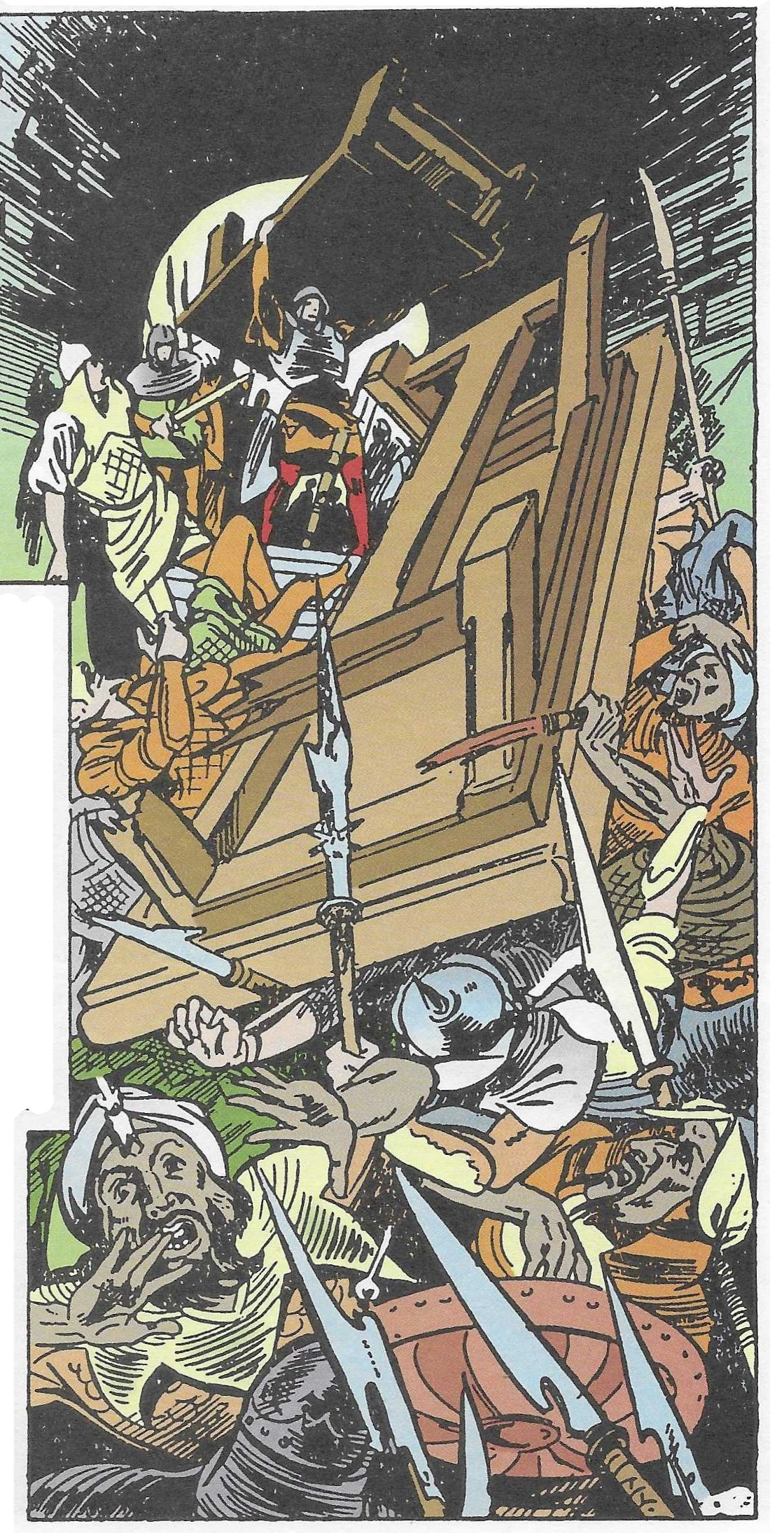 Cet ancrage chronologique est encore plus vrai dans le second épisode La Couronne d’épines. En effet, dès la première case de l’album le contexte historique est donné dans une case-texte, ensuite approfondi à la page 9. Il faut se souvenir qu’en 1204, la quatrième Croisade fut détournée de son but palestinien par la République de Venise et donc « Les croisés prirent Constantinople et fondèrent l’empire latin d’Orient ». Nous connaissons bien ces évènements par le récit du chroniqueur Geoffroy de Villehardouin, un des chefs croisés.